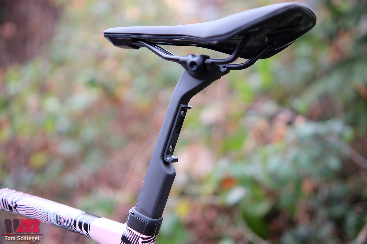 Der Rahmen des Scott ist heute kaum weniger aktuell als vor vier Jahren mit seinen markanten Aero-Formen und innen geführten Bremsleitungen. Durch die UDH-Kompatibilität ist er bei den Montagestandards auf dem neuesten Stand; nur ein Staufach im Unterrohr könnte man vermissen. Allerdings verzichten viele ganz neue Bikes der Kategorie „Gravel Race“ auf dieses Merkmal. Die Aero-Sattelstütze mit Kammtail-Profil wurde weiterentwickelt und verfügt nun über eine Aussparung an der Hinterseite. Diese soll den Komfort verbessern und kann dazu eine spezielle Rückleuchte aufnehmen, die sich nahtlos einfügt.
