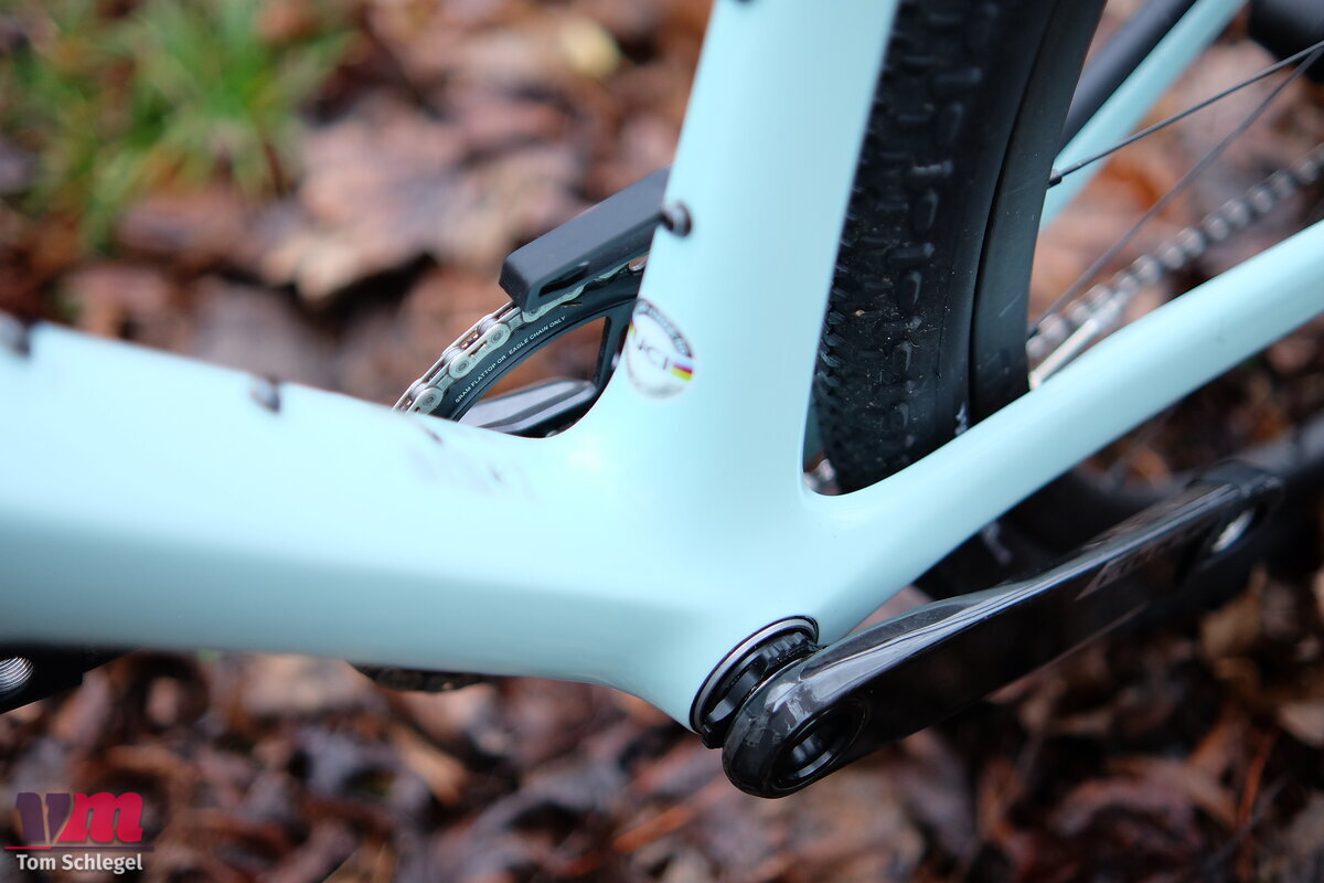 Bereits die ersten paar Pedaltritte zeigen nämlich: Das Addict Gravel ist ultra-vortriebsstark, setzt Drehmoment verlustfrei in Beschleunigung um und sorgt damit für ein seltenes Maß an Fahrvergnügen. Das Bike verführt dazu, immer wieder aus dem Sattel zu gehen und anzutreten, womit es an die Cyclocross-Wurzeln des Vorgängers anknüpft. Seine optimale Rahmensteifigkeit verdankt das Scott dem dank eingepresstem Innenlager breit bauenden Tretlagerbereich mit weit auseinander stehenden Kettenstreben. Schlanke Carbon- oder Aluminiumrahmen mit BSA-Innenlager sind hier merklich im Nachteil.