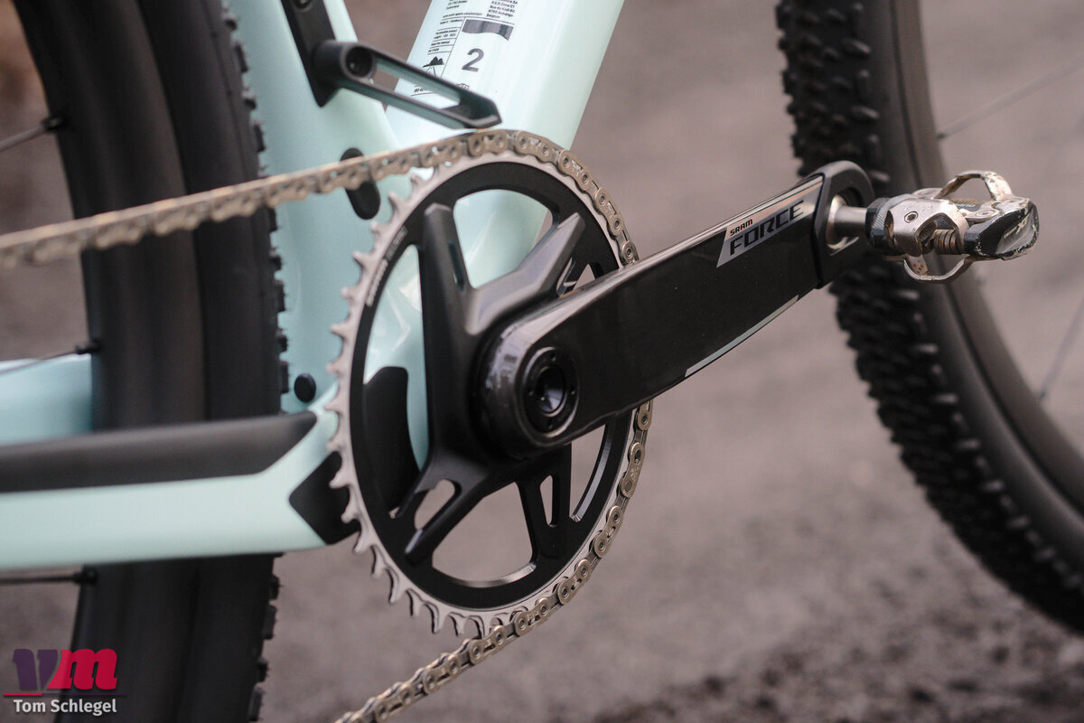 Zu den begeisternden Performance des Rahmens kommt eine Ausstattung, die keine Wünsche offen lässt. Der Schweizer Anbieter verbaut mit der SRAM Force XPLR die derzeit wohl beste Gravel-Gruppe am Markt: Mit ergonomisch sehr angenehmen Griffen, der präzisen, schnellen 13-Gang-Schaltung und deren optimaler Abstufung ist dieses Set-up über jede Kritik erhaben. Dazu gibt es starke, bestens dosierbare Bremsen und ein geringes Gesamtgewicht, womit die Force in Sachen Preis-Leistung derzeit nicht zu toppen ist.