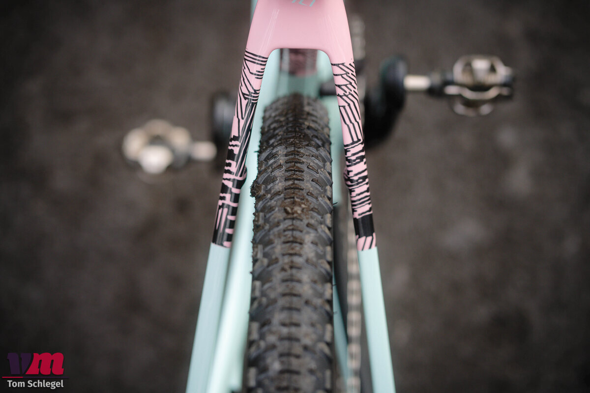 Die massige Gabel und das groß dimensionierte Steuerlager sorgen einerseits für eine steife Front bei harten Bremsmanövern, andererseits für Stabilität im Wiegetritt, wo schlankere Gabeln auch mal für schleifende Bremsbeläge sorgen. Hart ist das Addict Gravel dabei keineswegs, wofür am Heck die schlanke Stütze sorgt: Sie dämpft Stöße und Vibrationen, ohne bei hoher Tretfrequenz zu wippen.