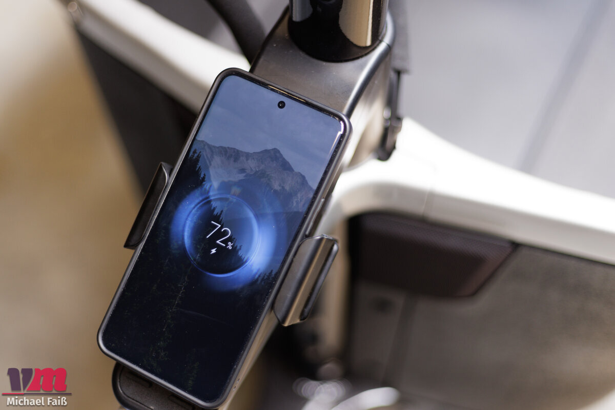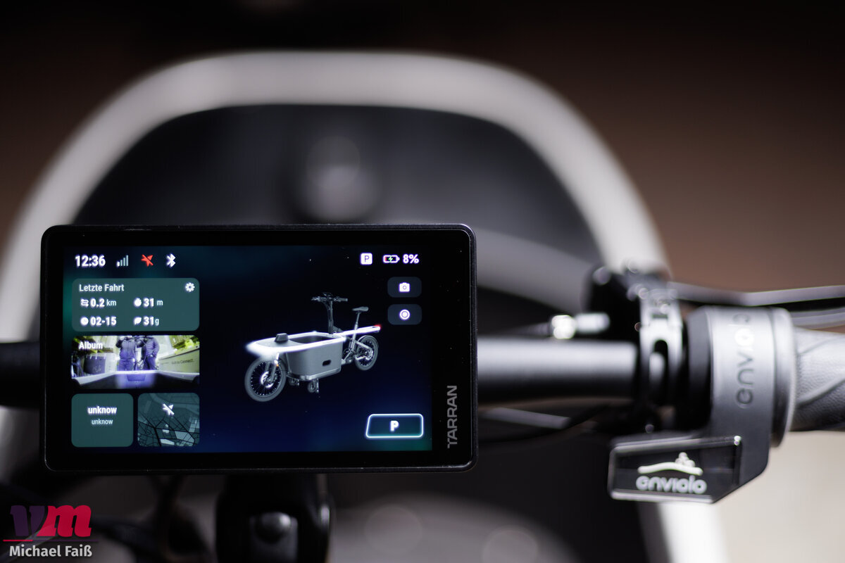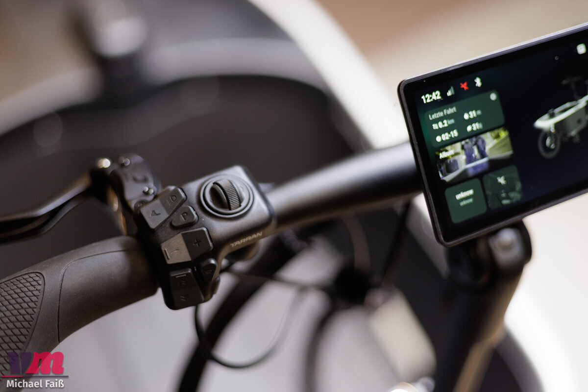 Die eigentliche Sensation des T1 Pro ist jedoch das eigens entwickelte Betriebssystem „TarranOS“, das über ein 5,2 Zoll großes Retina-Touch-Display in der Lenkermitte gesteuert wird. Das System übernimmt die komplette Steuerung des Rades. Entsperrt wird das Cargobike völlig schlüssellos via NFC-Karte oder per Smartphone-App. Das Cockpit fungiert dabei gleichzeitig als induktive Qi2.0-Ladestation (15 Watt) für das Handy, verfügt über zwei integrierte Bluetooth-Lautsprecher zur Musikwiedergabe und bietet zwei USB-Ladeanschlüsse.