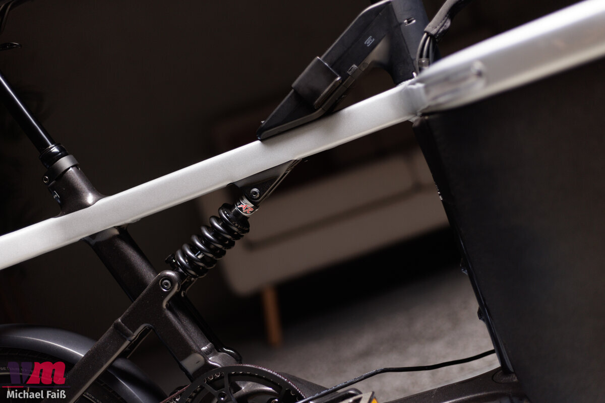 Hervorzuheben ist die exzellente Ergonomie. Das Rad folgt einem „One Size Fits All“-Konzept und lässt sich über den winkelverstellbaren Vorbau sehr gut an verschiedene Fahrer anpassen. Dazu trägt auch die serienmäßige Variostütze bei, die sich ganz bequem per Hebel unter dem Sattel absenken lässt. So findet man an der Ampel sofort einen sicheren Stand, ohne aus dem Sattel gehen zu müssen. Ein kleiner Kritikpunkt am Rahmendesign ist jedoch das relativ hohe Oberrohr. Gerade für kleinere Personen oder beim Fahren mit Rock ist der Auf- und Abstieg etwas umständlich, da man das Bein hinten über den Sattel schwingen muss. Ein tieferer Durchstieg würde die Handhabung im Alltag hier nochmals erleichtern.