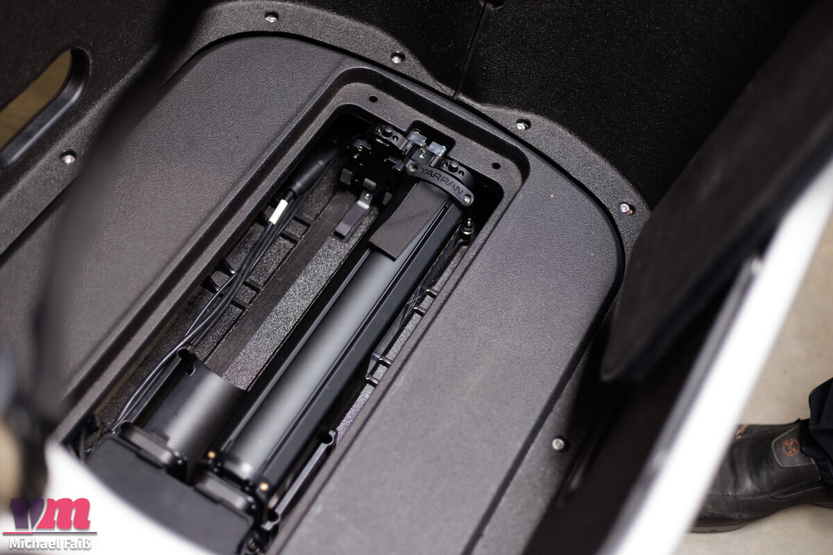 Angetrieben wird das T1 Pro von einem eigens gelabelten Mittelmotor, der laut Hersteller ein massives Drehmoment von 100 Nm sowie eine Spitzenleistung von 750 Watt liefert. Die Energieversorgung übernimmt im Standard-Setup ein intern verbauter, entnehmbarer Akku mit 708 Wattstunden. Wer längere Touren plant, kann das System dank eines vorgesehenen Steckplatzes im Unterboden der Ladebox mit einem zweiten Akku auf 1,4 kWh aufrüsten, was die Reichweite laut Tarran auf bis zu 200 Kilometer im Eco-Modus anhebt. Die clevere Positionierung der Akkus schützt diese dabei nicht nur vor Witterungseinflüssen, sondern erschwert auch einen Diebstahl.
