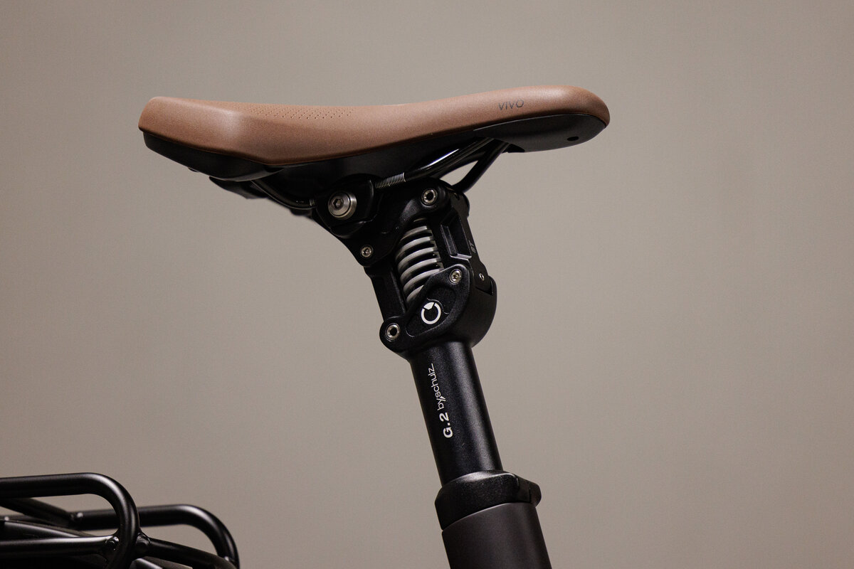 Für den Komfort am Heck sorgt ein technisches Highlight: die Parallelogramm-Sattelstütze von BySchulz. Im Gegensatz zu herkömmlichen Teleskop-Stützen spricht dieses System deutlich feinfühliger auf Unebenheiten an. Für ein SUV-Konzept ist dies oft die klügere Wahl im Vergleich zum vollgefederten Rahmen, da es weniger Wartungsaufwand bedeutet, das Gewicht reduziert und den Preis in Grenzen hält, während der Komfort für sitzende Fahrer auf fast identischem Niveau liegt.