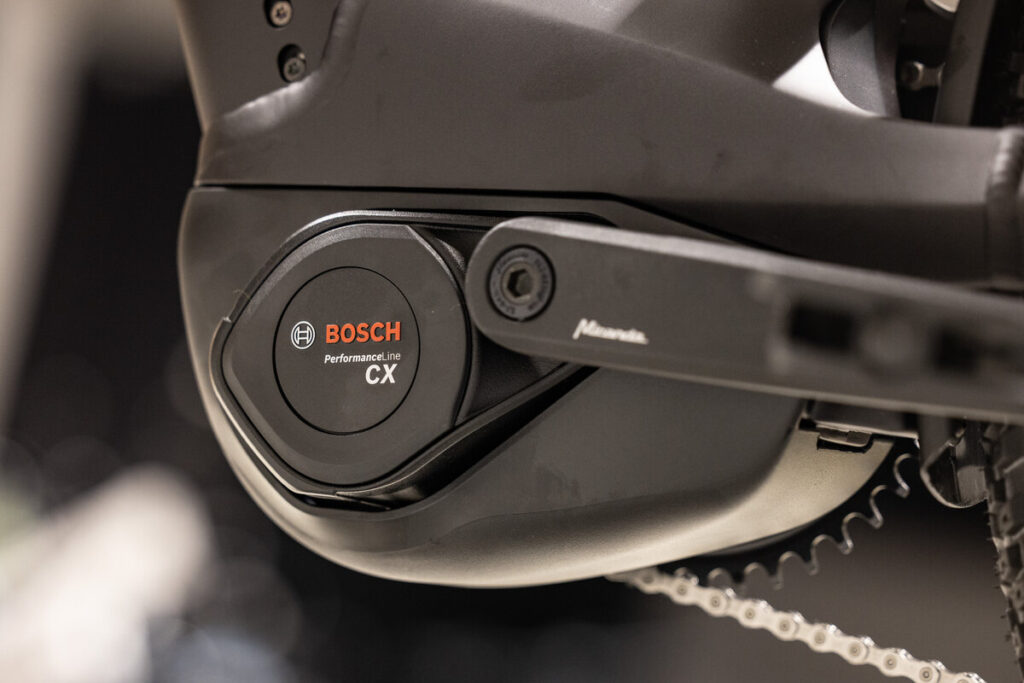 Der Bosch-CX-Motor schiebt gewohnt souverän an. Dosierbarkeit, Feinfühligkeit und die intuitive Bedienung sind einfach richtig gut! Die neueste Generation ist auch deutlich leiser – Motorklappern ist praktisch nicht mehr vorhanden. Optisch sehr gelungen ist die Integration des Akkus, und das trotz der Größe des 800er-Energieriegels. Der Ein- und Ausbau funktioniert recht gut, dürfte aber noch flüssiger bzw. intuitiver sein. Ein weiteres Lob verdient die Positionierung der Ladebuchse: Sie sitzt gut erreichbar am Rahmen und ist nicht – wie bei vielen Konkurrenten – hinter komplizierten Abdeckungen oder an umständlich zu erreichenden Stellen versteckt.
