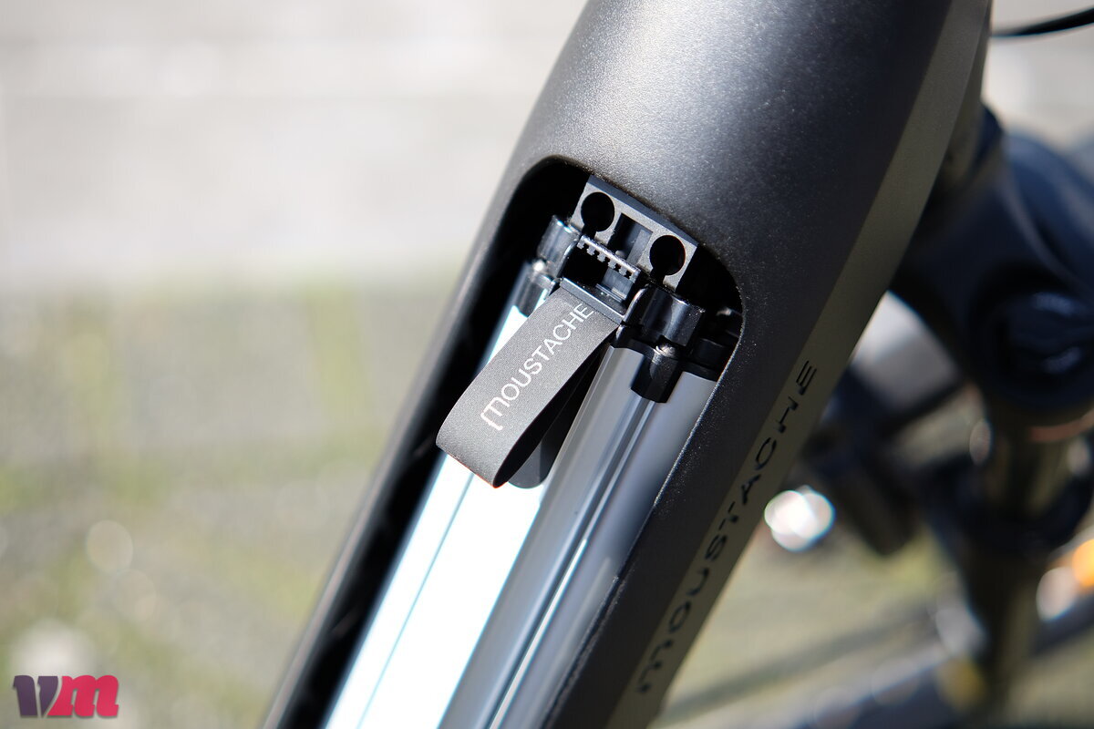 Beim typischen gefederten Hinterbau muss hinterm Tretlager Platz für den Schwingendrehpunkt sein, und das Federbein muss auch irgendwo untergebracht werden – das führt zu teils ziemlich komplexen und damit nicht gerade eleganten Lösungen. Moustache kann sich die Sache dagegen einfach machen: Das Federbein steht fest senkrecht und nimmt kaum Platz weg; der Drehpunkt wurde ganz nach vorne über den Motor verschoben. Das Ergebnis ist eine ausgesprochen schlichte Rahmenkonstruktion, die optisch ihres Gleichen sucht.