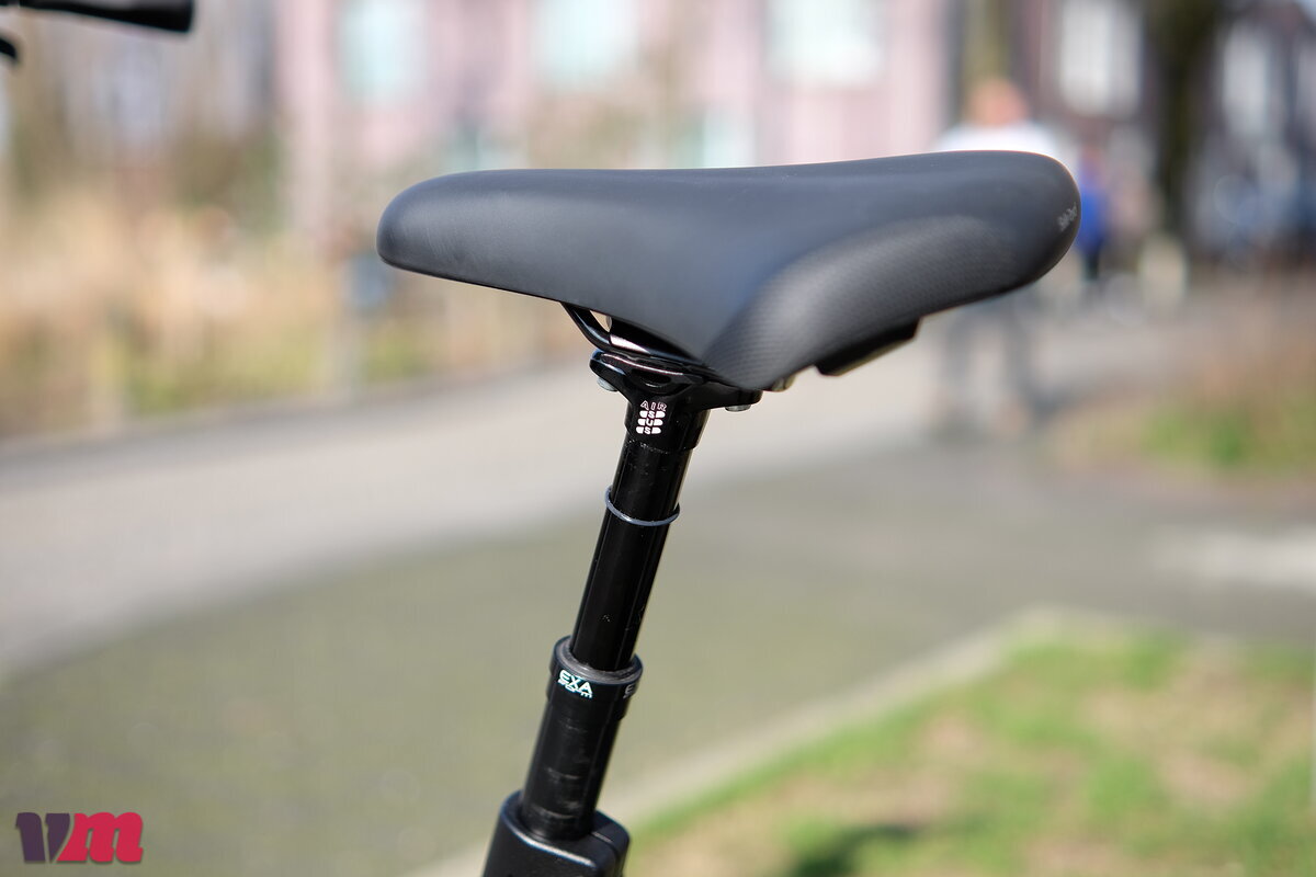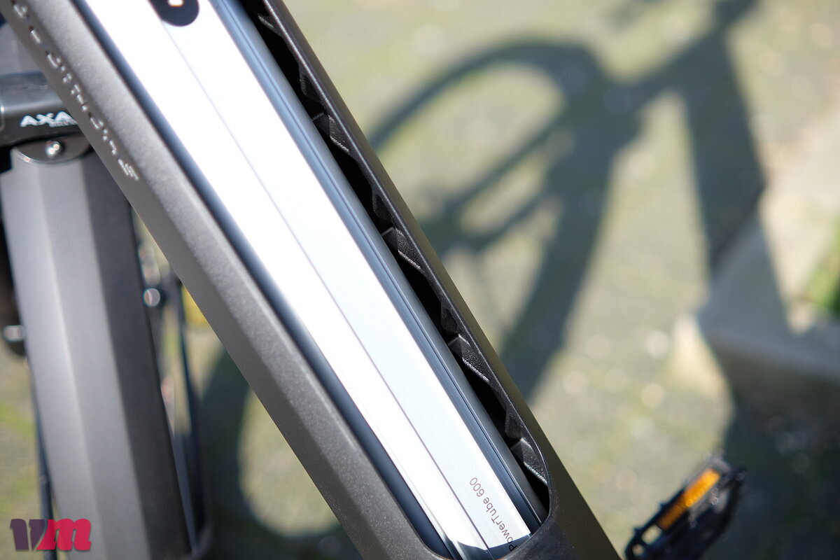 Gegen den 540-Wh-Akku lässt sich nichts sagen, und auch die Shimano-Fünfgangnabe ist den meisten Fahrsituationen gewachsen. Ein kleiner Nachteil des günstigen City-Fullys ist die weniger gut einstellbare Stahlfedergabel; andererseits sind alle Ausstattungsmerkmale des Topmodells auch hier vertreten: der in den Vorbau integrierte 80-Lux-Strahler, das Ringschloss am Vorderrad, die absenkbare Stütze und die breiten, weich abrollenden Schwalbe-Reifen.