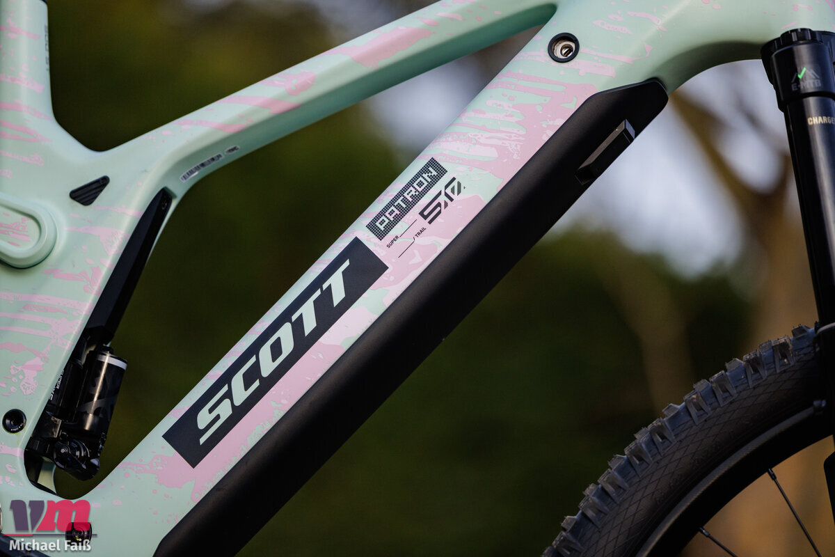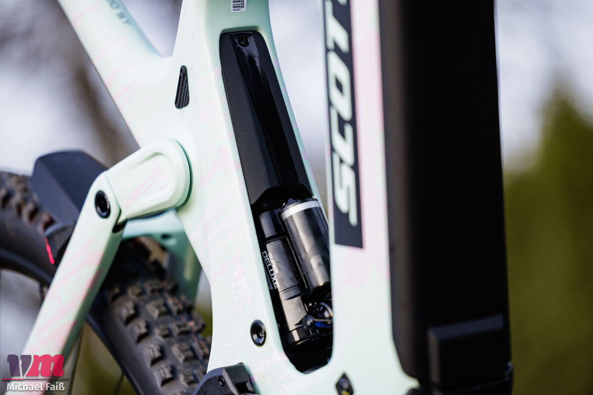 Sämtliche Leitungen und Züge verschwinden bereits unterhalb des Vorbaus in speziellen Spacern und werden komplett unsichtbar durch den Rahmen geführt. Das prominenteste Merkmal ist jedoch der in den Rahmen integrierte Dämpfer. Er sitzt versteckt und vor Schmutz geschützt im Oberrohr unter einer abnehmbaren Klappe. Die Optik, die dadurch entsteht, ist extrem aufgeräumt und eigenständig, besonders in Kombination mit den auffälligen Decals und Farben, bei denen Scott erfreulich viel Mut beweist. Auch der Schutz des Rahmens ist vorbildlich: Kettenstreben- und Sitzstrebenschutz sind großzügig dimensioniert, und der Hinterbau ist komplett geschlossen, sodass sich keine Steine oder grober Schmutz in den Zwischenräumen verklemmen können.