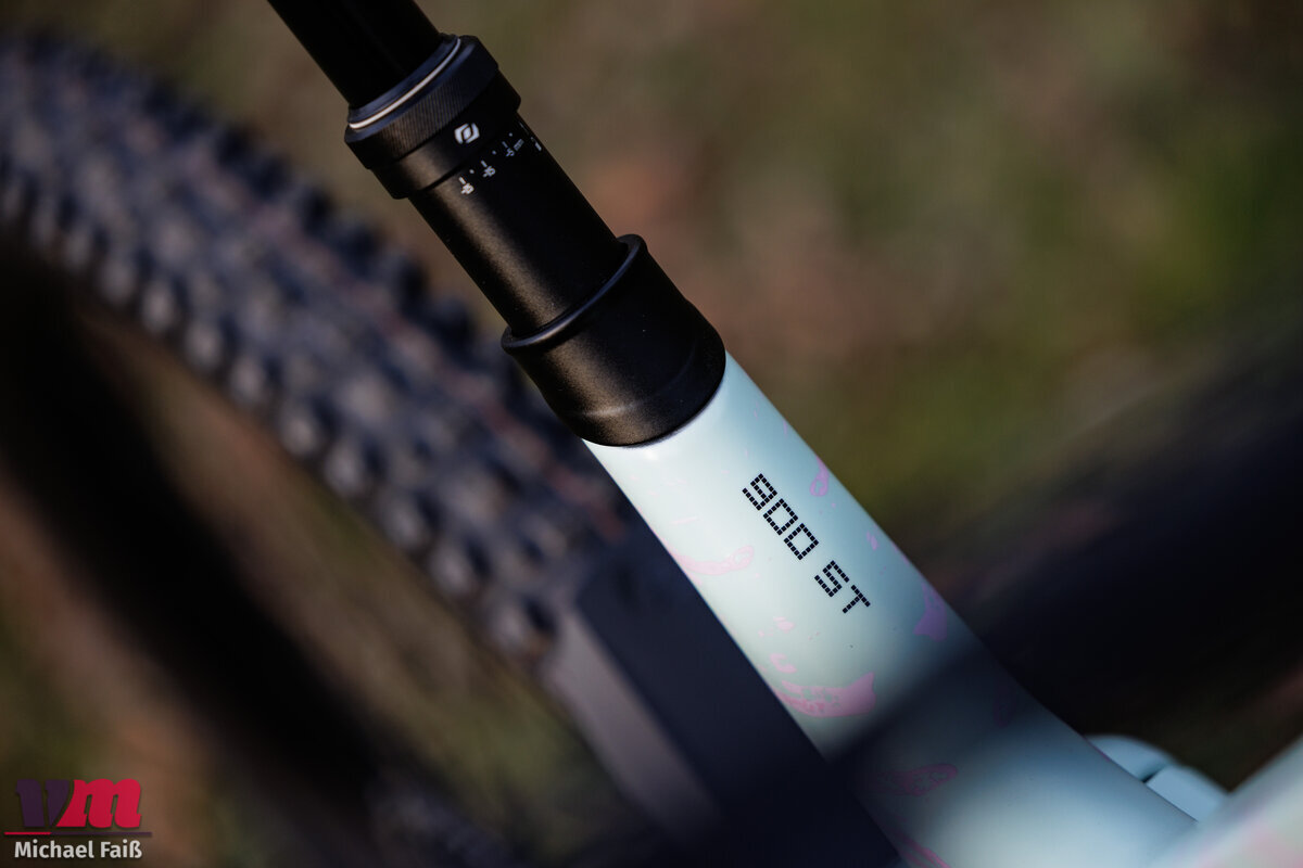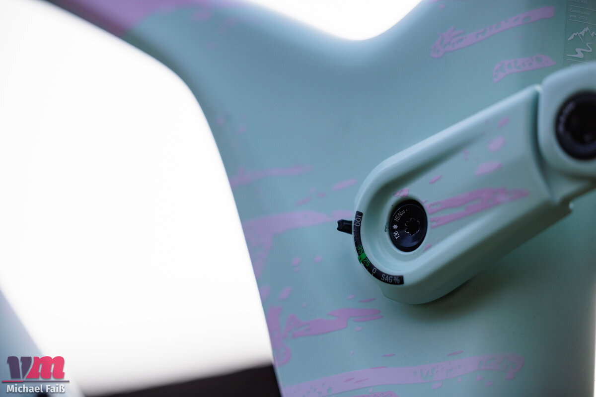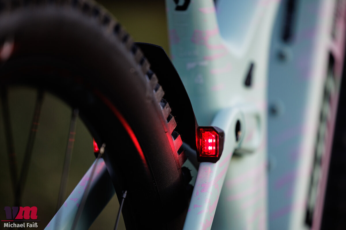 Natürlich bringt dieses Maß an Integration Kompromisse bei der Wartung mit sich. Das Aufpumpen des Dämpfers oder die Verstellung der Zugstufe am Trunnion-Mount erfordern etwas mehr Fingerspitzengefühl als bei einem offenliegenden Dämpfer. Scott hat diesen Umstand jedoch bedacht und clevere Detaillösungen integriert. So verfügt der Rahmen über eine außenliegende Sag-Anzeige. Da die Kolbenstange des Dämpfers nicht sichtbar ist, lässt sich der Negativfederweg so dennoch extrem komfortabel und präzise ablesen. Ein weiteres cleveres Detail der Integration ist die Kombination aus einem kleinen hinteren Fender und einer direkt in das System integrierten LED-Rückleuchte, die bequem vom Lenker aus aktiviert werden kann.