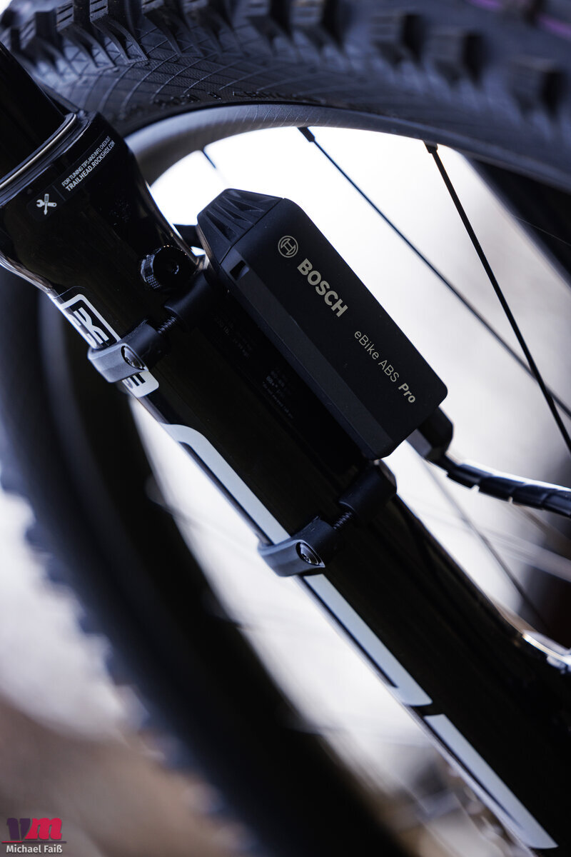Ein kontrovers diskutiertes Bauteil an unserem Testbike ist das Bosch E-Bike ABS Pro, gekoppelt an die Shimano XT Bremsen. In Kommentarspalten wird das System oft von versierten Mountainbikern als „überflüssig für Könner“ abgetan. Doch die Realität auf dem Trail sieht anders aus.