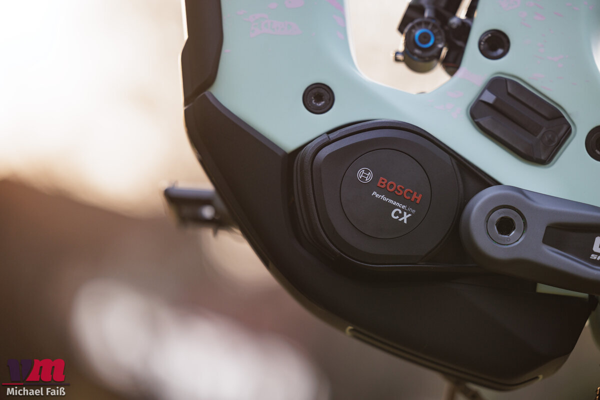 Angetrieben werden alle neuen Patron-Modelle vom mittlerweile bewährten Bosch Performance Line CX Motor der 5. Generation. Während das absolute Spitzenmodell mit dem nochmals exklusiveren CX Race Motor ausgestattet ist, verrichtet in unserem Testbike, dem Patron ST eRIDE 900, der reguläre CX Gen 5 seinen Dienst. Mit 100 Nm maximalem Drehmoment und bis zu 750 Watt Spitzenleistung (die über die Bosch eBike Flow App individuell konfiguriert werden kann) liefert das Aggregat mehr als ausreichend Vortrieb für schwerstes Gelände.