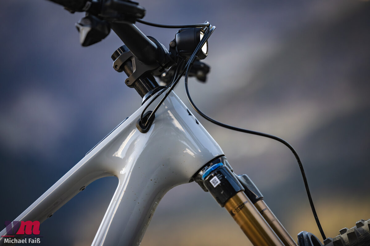 Der Lenkwinkel liegt standardmäßig bei abfahrtsorientierten 64,2 Grad. Über im Lieferumfang enthaltene Lagerschalen lässt sich dieser in 0,5-Grad-Schritten auf bis zu 63,2 Grad abflachen oder auf 65,2 Grad ansteilen. Ein kürzeres Sitzrohr (über alle Größen hinweg) mit einem steilen Sitzwinkel von 78 Grad sorgt zudem für eine zentrale, effiziente Kletterposition.