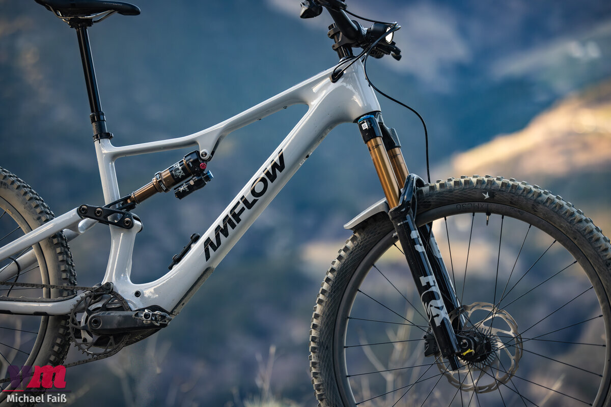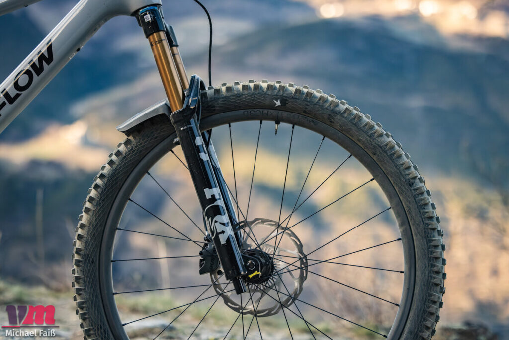 Das „Pro“ im Namen schlägt sich in einer extrem hochwertigen Ausstattung nieder. Das Fahrwerk stammt aus dem Hause Fox und kommt in der Factory-Ausführung. An der Front arbeitet die aktuelle 36er Gabel mit der feinfühligen GRIP X2 Kartusche. Dass Amflow hier bewusst nicht auf die wuchtigere Fox 38 setzt, unterstreicht den auf Agilität getrimmten Charakter des Bikes und spart Gewicht. Am Heck kümmert sich ein speziell auf das Bike abgestimmter Fox Float X Factory Dämpfer um die 150 mm Federweg.