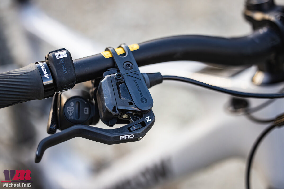 Wo viel Licht ist, gibt es auch ein wenig Schatten. Die Ausstattung ist insgesamt erstklassig, doch die Magura Gustav Pro Bremse sorgte im Test für gemischte Gefühle. Die Bremskraft und Dosierbarkeit sind grundsolide, erfordern aber etwas mehr Fingerkraft als beispielsweise eine SRAM Maven. Ergonomisch fielen die klobigen Geber aus Kunststoff negativ auf, zudem ließen sich die Bremshebel für Fahrer mit kleineren Händen nicht nah genug an den Lenker stellen. Das größte Manko zeigte sich jedoch in der Geräuschkulisse: Während der Rahmen, die Leitungen und der Motor absolute Stille wahren, klapperten die Bremsbeläge der Gustav Pro im vorderen Bremssattel bei unebenem Untergrund hörbar. Ein vertikales Spiel der Beläge war hier die Ursache.