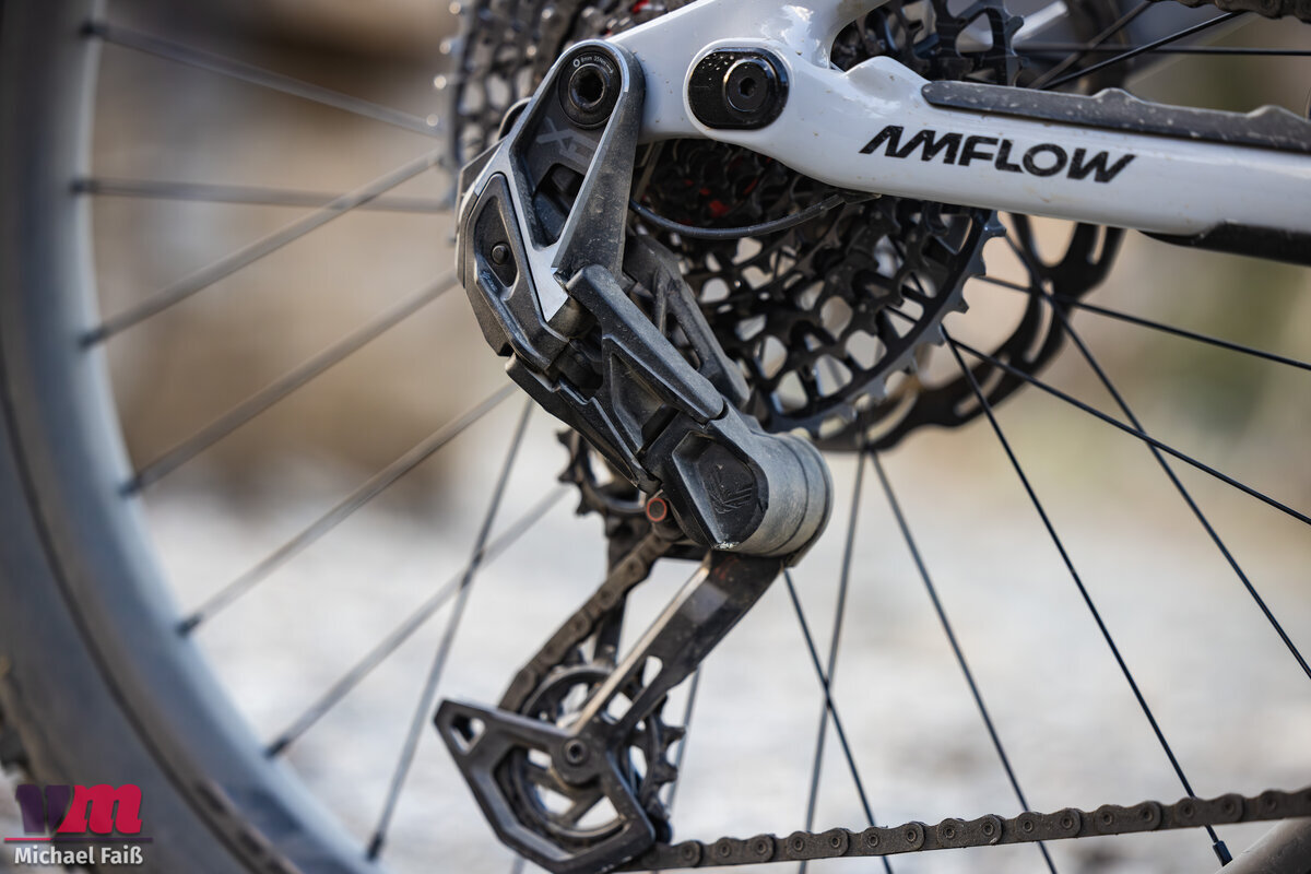 Verzögert wird mit der Magura Gustav Pro. Die Vierkolben-Bremse greift auf mächtige 203-mm-Bremsscheiben zurück, die beeindruckende 2,5 mm stark sind. Clever: Die hintere Bremsscheibe fungiert gleichzeitig als integrierte Sensorscheibe für den Motor. Den Kontakt zum Boden stellen hauseigene Amflow XMC-30 Carbon-Laufräder her, auf denen robuste Schwalbe Radial Reifen (Magic Mary vorn, Albert hinten) mit Gravity Karkasse montiert sind.
