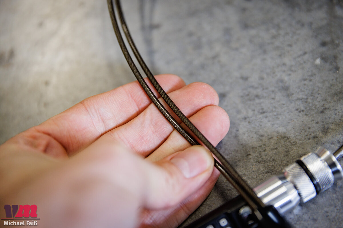 Die Montage ist schnell erledigt: Dazu brauchst du lediglich einen 8-mm-Inbus, am besten als Drehmomentschlüssel, und gegebenenfalls einen flachen Schraubenzieher, um die Endkappe des Griffes zu entfernen. Dann schiebst du den Expander mit aufgestecktem Zahlenschloss in den Lenker, fixiert ihn dort mittels des 8-mm-Inbusses (Achtung: nur handfest anziehen!), und zuletzt musst du noch deine persönliche Zahlenkombination für das Schloss festlegen. Jetzt ist das Schloss immer fest mit deinem Bike verbunden und du muss brauchst bloß noch das Kabel hervorziehen, um dein Bike abzuschließen.