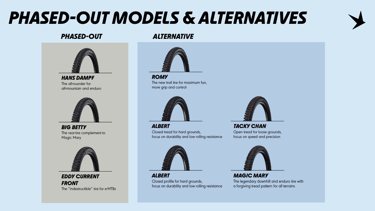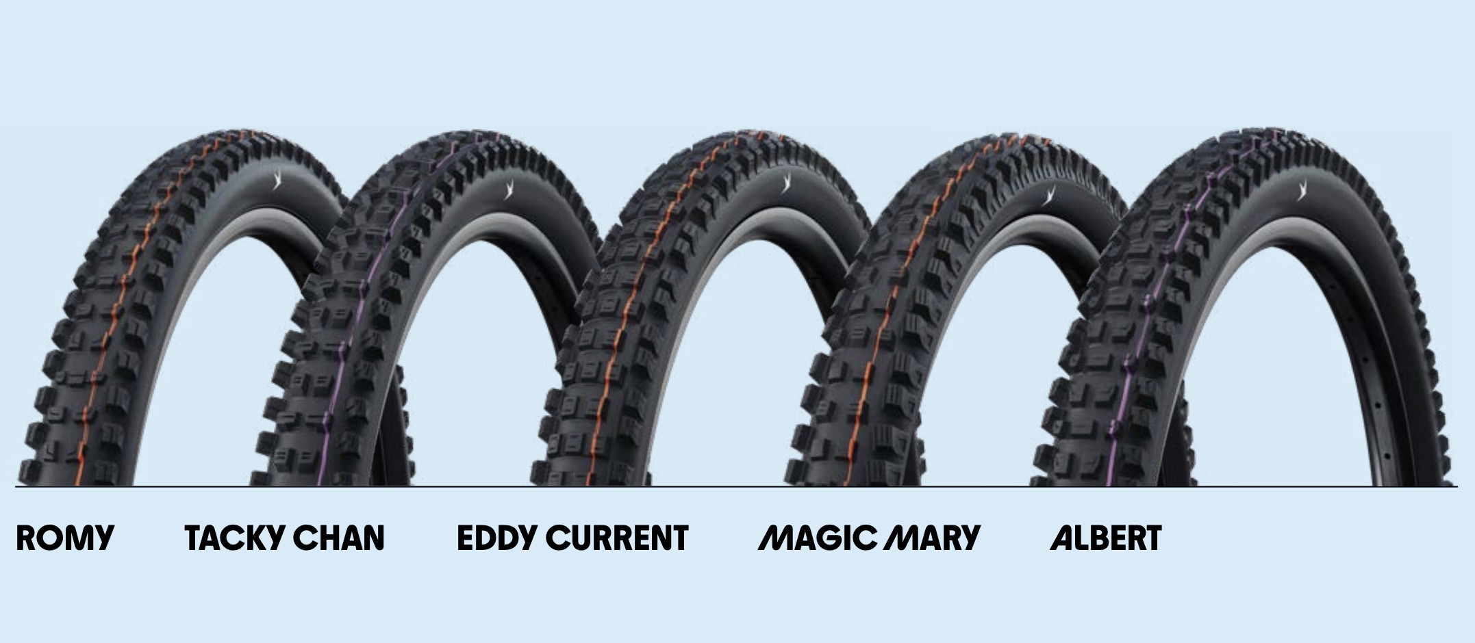 Der „schnellste Downhill-Reifen“, wie Schwalbe den Tacky Chan nennt, kommt in der neuen 2,5″ Breite ausschließlich als Radial-Reifen. Dafür wurde auch das Profil optimiert, sodass der Reifen nun die bekannte Big Betty ersetzen wird. Zudem bietet Schwalbe beim Eddy Current ab sofort nur noch die Hinterrad-Variante als Gravity Pro Radial-Version an. Der Zusatz „Rear“ entfällt damit. Die Magic Mary und der Albert in der Radial-Version heißen mit dem Update nun ebenfalls neue Größen sowie Compound- und Karkassen-Kombinationen willkommen.