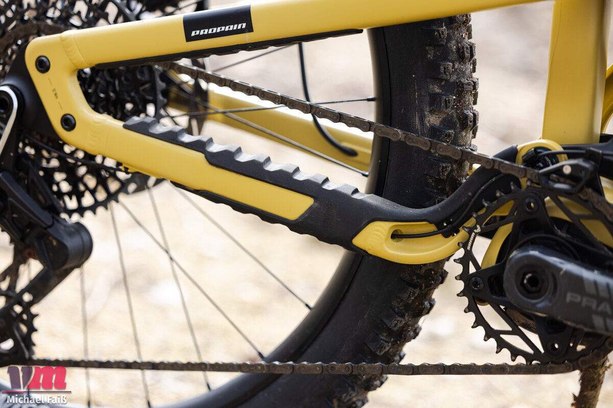 Dass Propain beim Ekano 3 AL auf Aluminium als Rahmenmaterial setzt, ist kein Kostenspar-Zwang, sondern bewusste Philosophie. Das Bike ist für harte Einsätze und Rider konzipiert, die ihr Material nicht schonen wollen. Entsprechend wuchtig und robust tritt der Rahmen auf. Um diesen zu schützen, sind großzügige Protektoren an der Sitz- und Kettenstrebe angebracht.