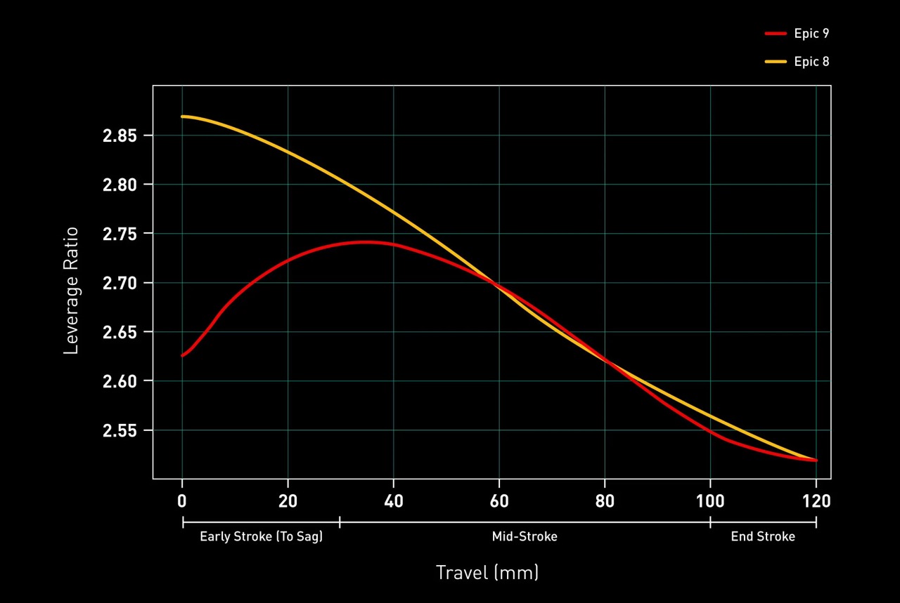 Spannend ist die Kinematik, die beim Epic 9 speziell an die Anforderungen von XC-Strecken angepasst wurde. Die auffälligste Änderung gegenüber dem Epic 8: Bis zum Sag ist das Übersetzungsverhältnis degressiv gestaltet. Das heißt, der Hinterbau verharrt am liebsten um den Sagpunkt. Dadurch konnte das Zusammenspiel aus Kinematik und Antriebseinflüssen an dieser Stelle besonders gut optimiert werden – wie sich der Hinterbau tatsächlich fährt, lässt sich aber nur durch einen Test beurteilen.