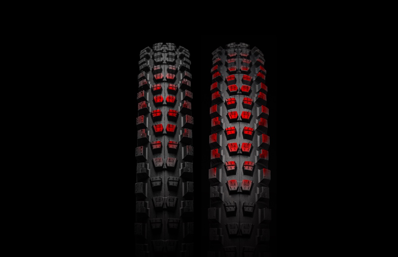 Links der Butcher mit Standard Grid Gravity-Karkasse, rechts mit neuer Radial-Karkasse. Dank des Sweet Ply-Gewebes soll der Reifen bei gleichem Luftdruck mehr Aufstandsfläche bieten – und damit laut Specialized 30 % mehr Grip.