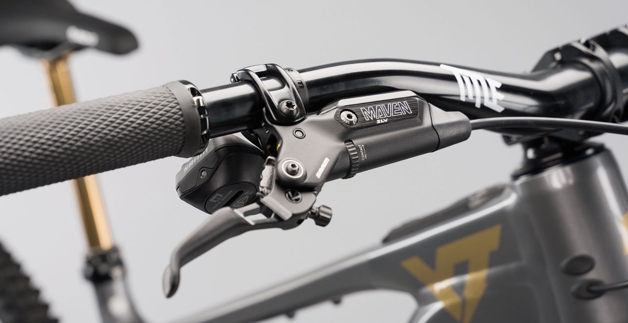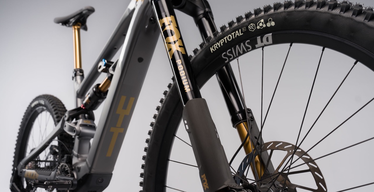 Zum Start des neuen Modells ist das Decoy X ausschließlich in einer Launch Edition für knapp 8.500 € erhältlich. Der Aluminiumrahmen kommt in einer grau-metallischen Lackierung mit Goldapplikationen, und auch beim Fahrwerk blitzt es golden auf: Eine Fox Podium Upside-Down-Federgabel verwaltet die 170 mm Federweg an der Front, hinten werkelt ein Fox Float X2 in der Factory-Ausführung. Antriebspflichten übernimmt eine edle SRAM XO T-Type Transmission. Ein weiteres Schmankerl ist das Cockpit, das aus dem Hause Title kommt. Daran klemmen SRAM Maven Silver Bremsen, die mit dem neuen B1-Swing-Link kommen. Das Decoy X rollt übrigens auf DT Swiss HX1500 mit DT Swiss 240 DEG DF Nabe, die den Pedalrücklschlag reduziert. Die Mullet-Bereifung besteht aus einem Satz Continental Kryptotals, hinten sogar mit Downhill-Karkasse und vorne in weicher Super Soft Mischung.